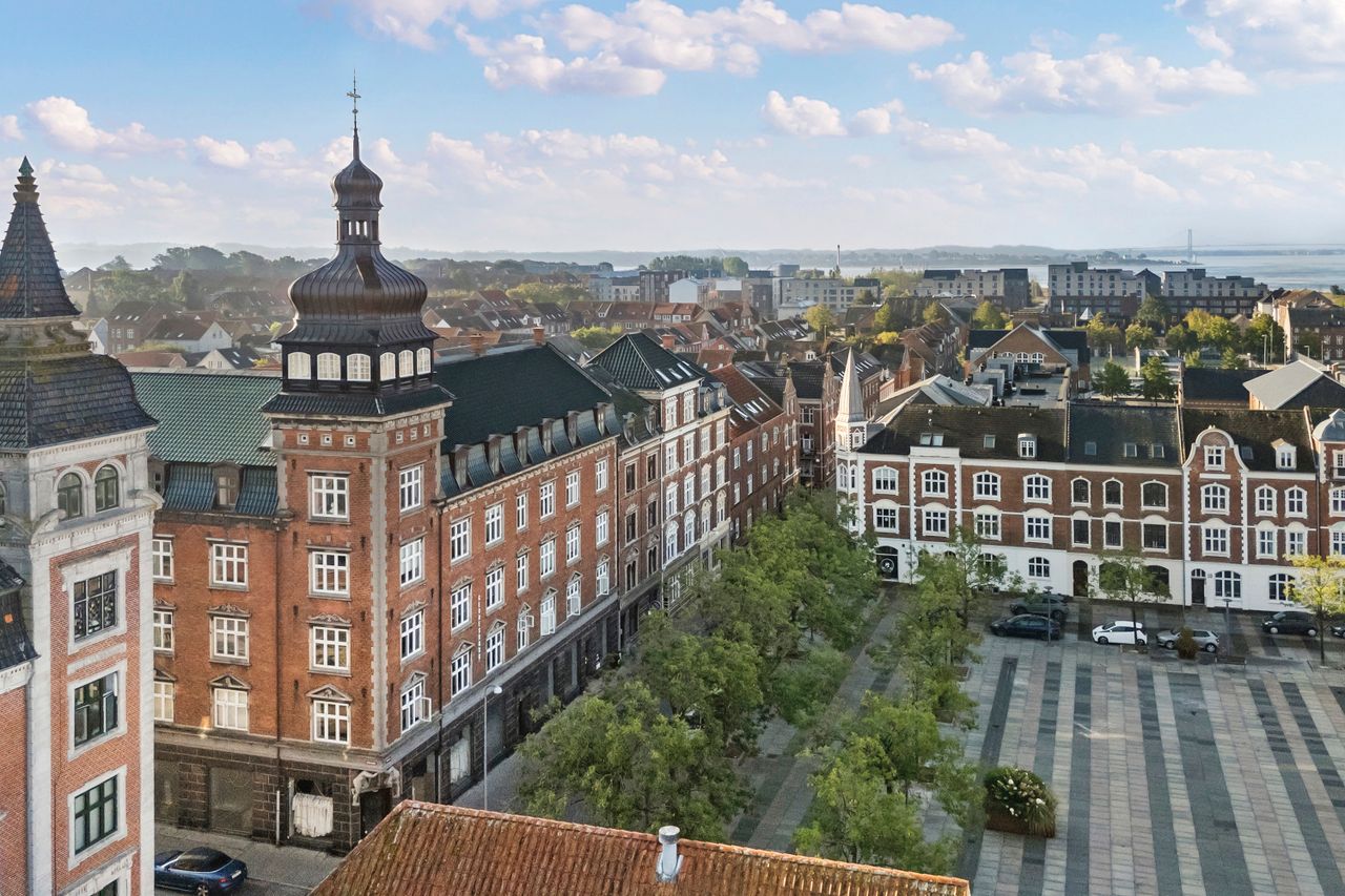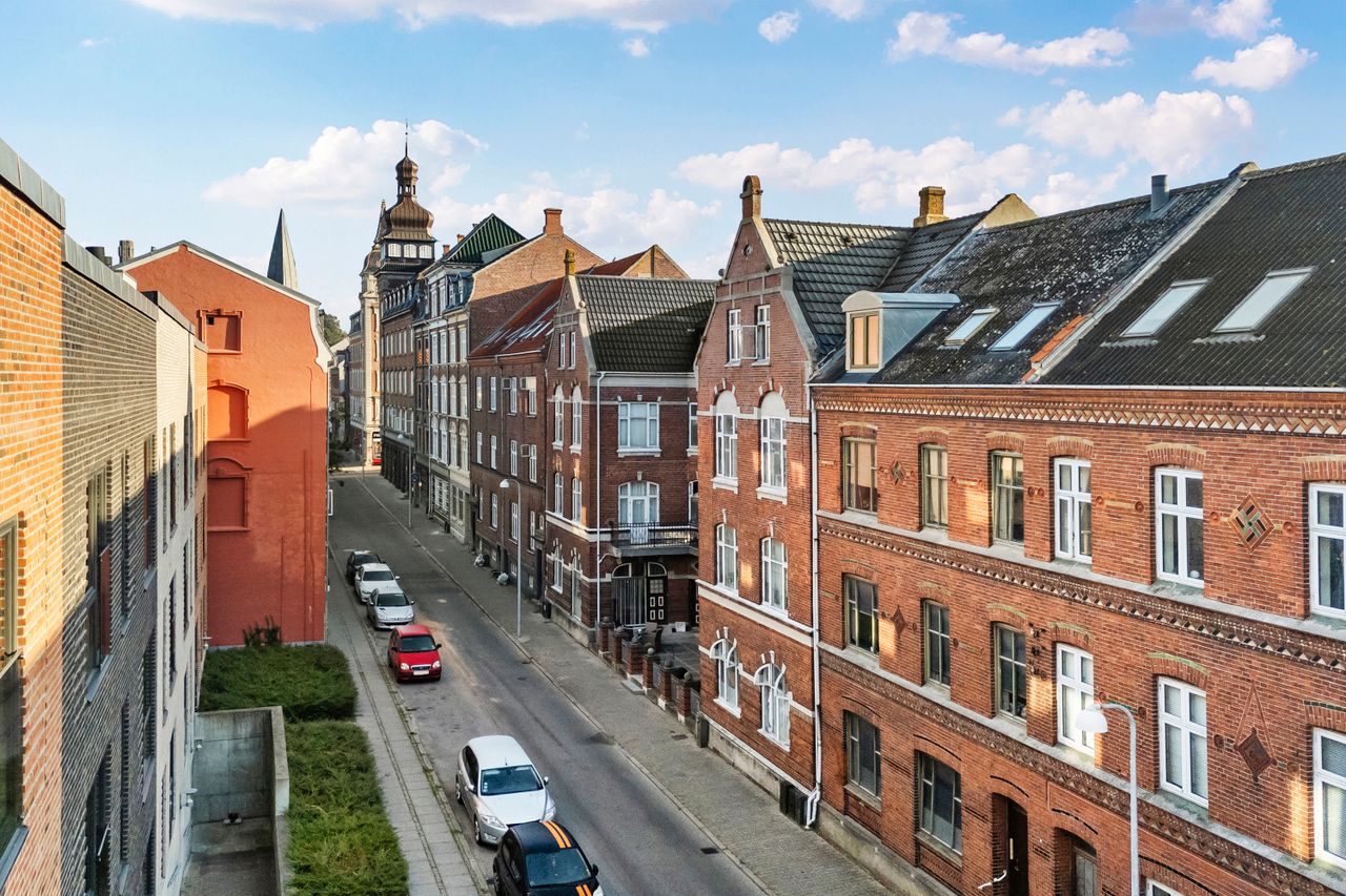 Markant spændende udlejningsejendom, opført i røde mursten og pålagt decratag for ca. 20 år siden og i samme forbindelse ny isolering på loftet.