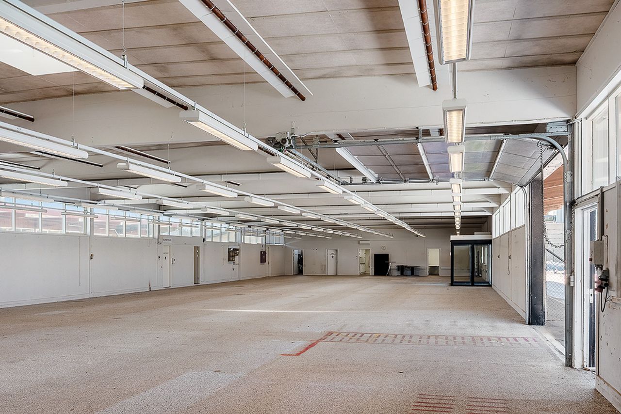 Hal på ca. 643 m² med portindkørsel - vindfang - disponibelt rum - toilet.