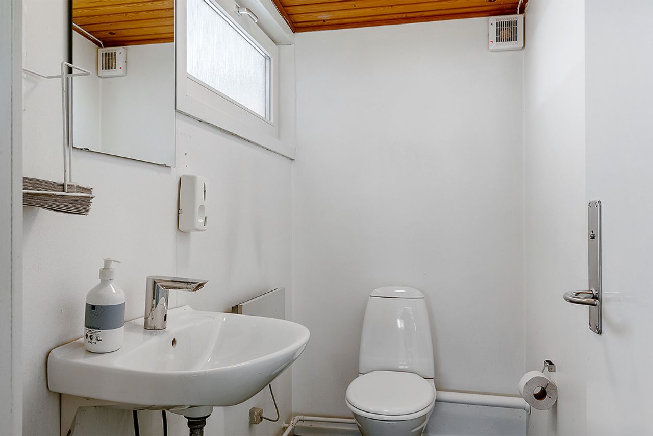 Administrationsafdeling med kantine/kontor adskilt med skydevæg - teknikrum - mandskabsrum med 2 toiletter.