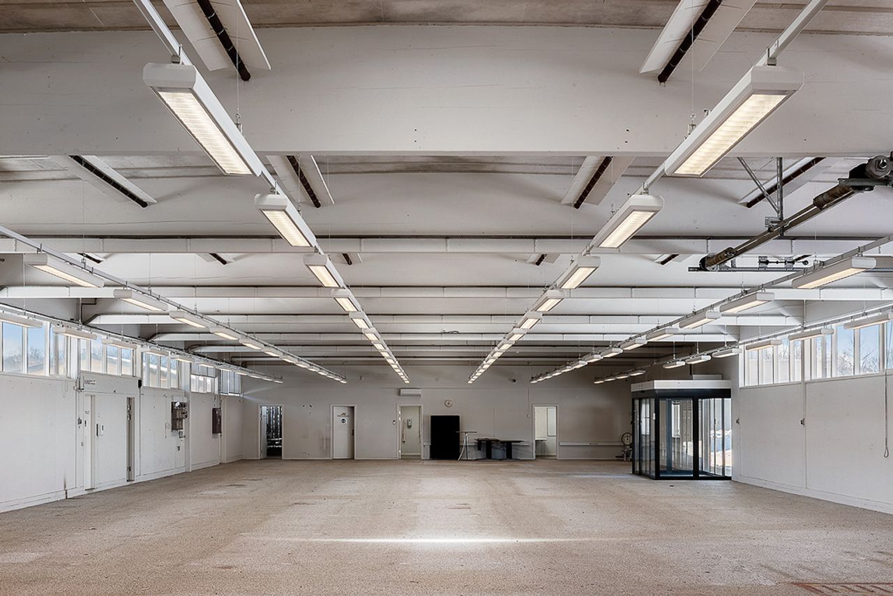 Hal på ca. 643 m² med portindkørsel - vindfang - disponibelt rum - toilet.